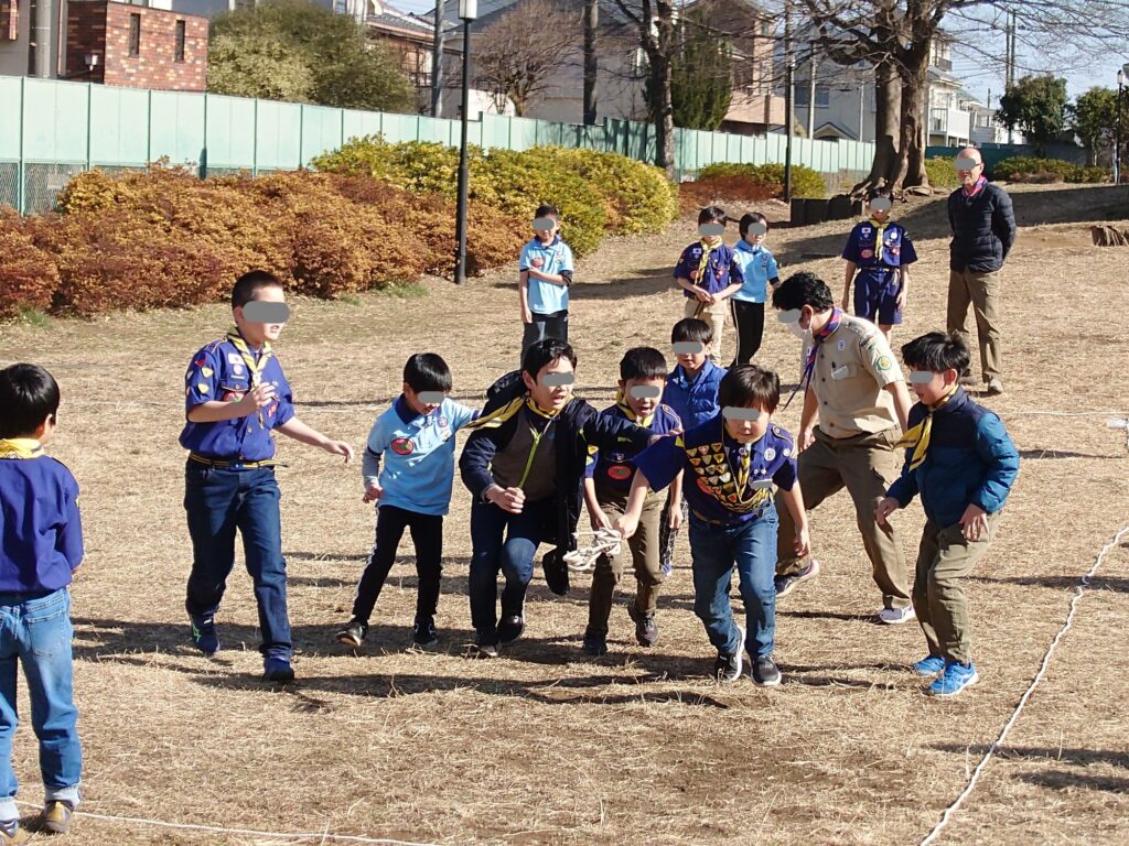 机での勉強タイムが長くなったので、近くの公園へ移動して集合体形や「仲良しの輪」の練習や、ゲーム「ロープ取り」を行いました。 カブ隊のお兄さん達にも負けない、元気いっぱいの「りす」たちの姿に隊長もびっくりです。