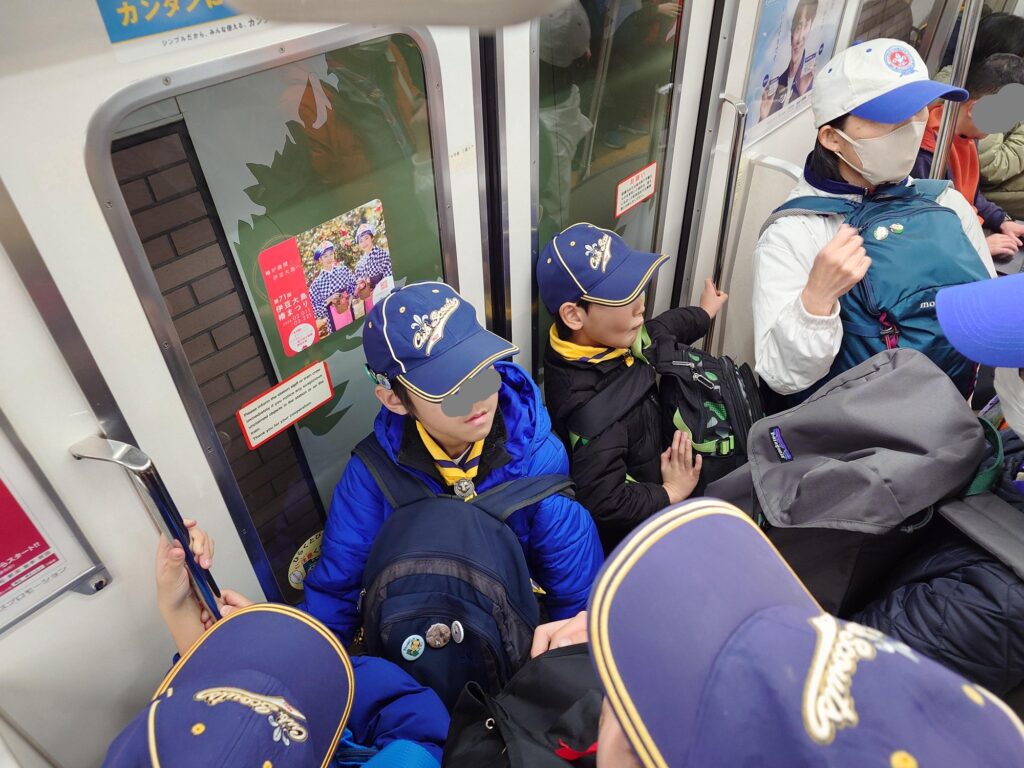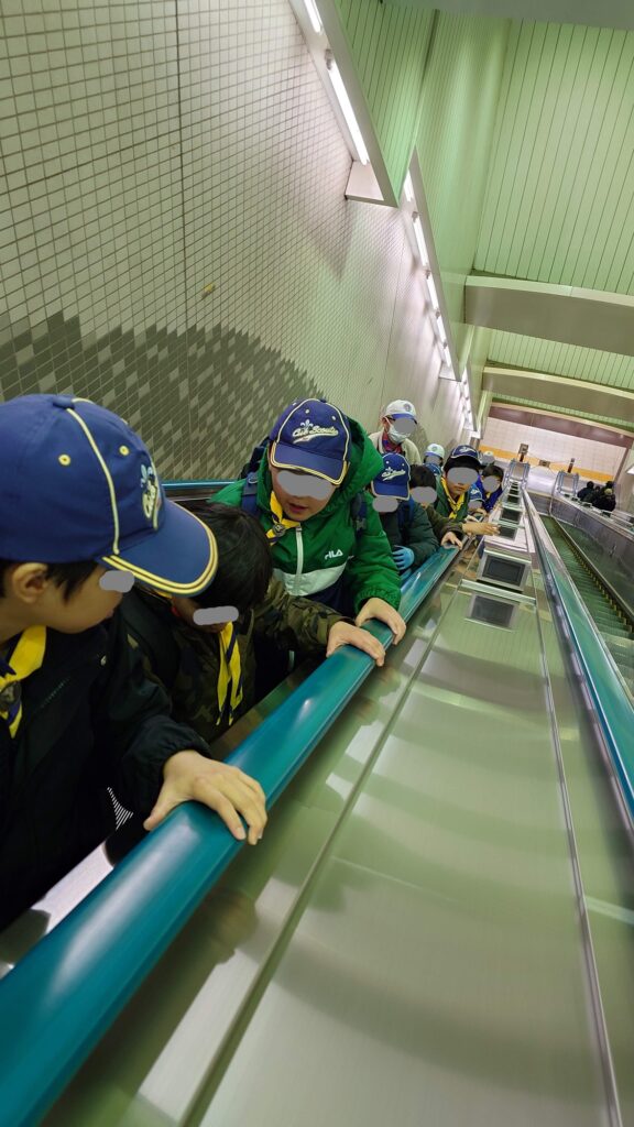 都営大江戸線は他の地下鉄のトンネルや上下水道、更にビル基礎等を避けるために、大深度地下鉄です。 初めて乗るスカウトは、長~い長いエスカレーターにちょっと興奮気味。